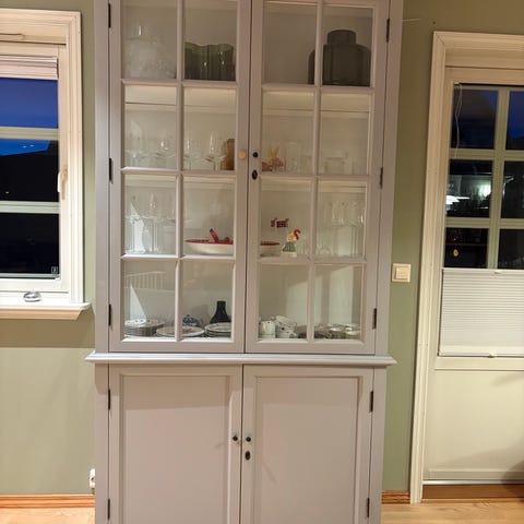 100 år gammel malt skjenk i heltre. Todelt med dobbel glassdør på øvre del med 2 hyller.Nedre del med 2 skuffer og dør med 1 hylle innvendig .