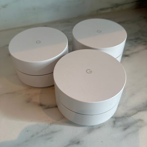 Google Wifi mesh router i hvit farge. Systemet består av flere runde enheter som sammen gir trådløst nettverk i boligen. Hver enhet fungerer som en node i et mesh-nettverk og kobles til strøm med medfølgende strømadaptere. En av enhetene kobles til modem eller hovedruter via nettverkskabel (ikke synlig på bildene). Egnet for å dekke flere rom eller et større område med trådløst nettverk, avhengig av antall noder som tas i bruk.
