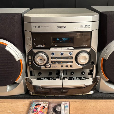 Philips stereopakke med hovedenhet, to høyttalere og fjernkontroll. Anlegget har innebygd radio og CD-spiller med plass til flere plater (3 CD-veksler ifølge frontmerking). Høyttalerne er frittstående og kobles til hovedenheten med kabler. Fjernkontrollen gir tilgang til grunnleggende funksjoner som volum, sporvalg og radiobetjening. Egner seg som kompakt musikkanlegg til stue, soverom eller kontor der man ønsker en samlet løsning for radio og CD-avspilling.