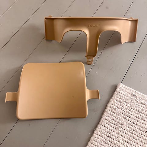 Selger Stokke Tripp Trapp stol med putesett i beige og ryggstøtte.
