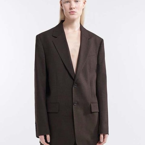 Grå ullblazer i str 38. Jeg opplever den som litt stor i størrelsen og den er antagelig mer en str 40. Bent snitt og behagelig å ha på.