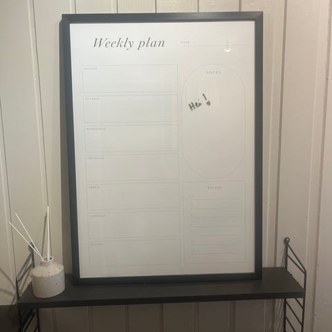 Gir bort en ukeskalender, magnetisk. Godt brukt, noe tusj vi ikke får bort.
