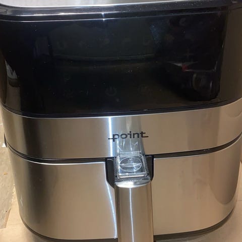 Point airfryer i kombinasjon av svart plast og børstet rustfritt stål. Modellen har digitalt display på fronten med temperaturvisning og betjeningsknapper for justering av tid og varme. Kurven har non-stick belegg og uttakbar rist som gjør det enklere å rengjøre etter bruk. Egnet til tilberedning av ulike typer mat som pommes frites, kylling, grønnsaker og annen ovnsstekt mat ved hjelp av varmluft. Enheten har håndtak i front for enkel uttrekking av kurven og står på benk eller bord under bruk.