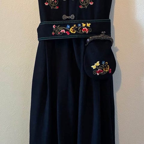 By Malina bunad for dame i størrelse XXL. Bunaden har liv i mønstret flerfarget stoff og svart stakk med broderte detaljer nederst. Skjorten er i lys bomull med enkel krage og knappelukking foran. Sølvfargede hekter og kjede foran på livet, samt belte med dekorerte spenner og tilhørende veske i svart stoff med broderi. Materiale oppgitt som bomull. Passer til bruk ved høytider og andre formelle anledninger der bunad er ønsket antrekk.