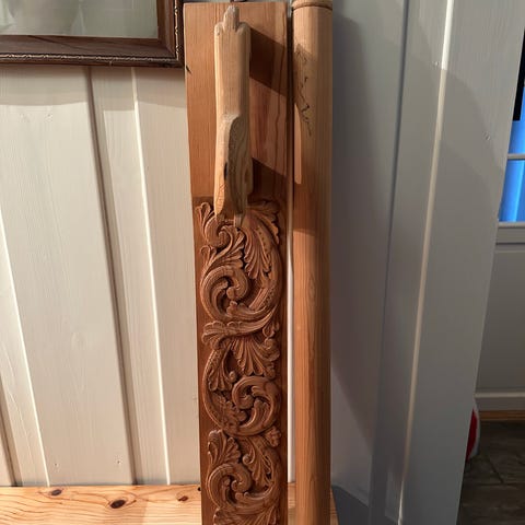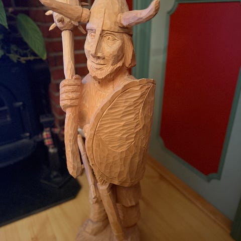 Håndlaget strykeinstrument i tre med utskåret dekorativ maskeform i endestykket. Instrumentet har hul resonanskasse, tre stemmeskruer og flere strenger. Medfølgende bue i lyst materiale. Lengden på instrumentet er omtrent som vist ved siden av tommestokk på bildene (omtrent 40–50 cm). Egner seg som musikkinstrument eller dekorativ gjenstand.