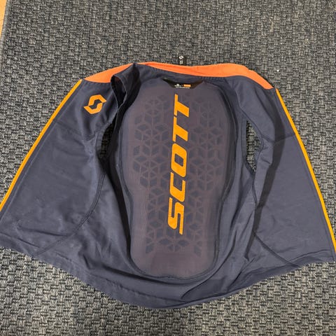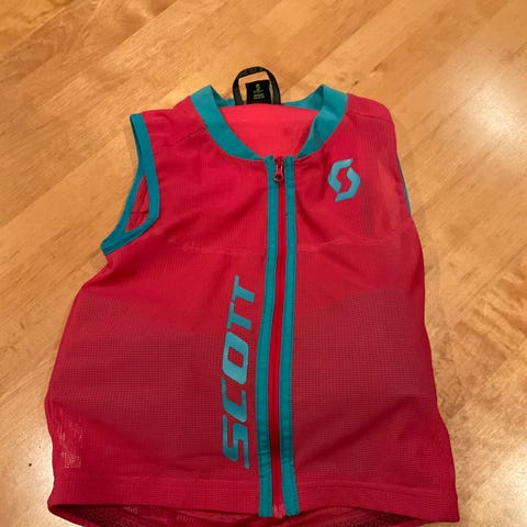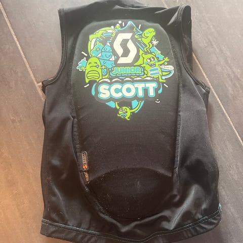 2 stk Scott ryggskinne for barn, størrelse S, oppgitt for høyde ca. 140–155 cm (alder 9–11 år). Ermeløs modell med hel glidelås i front. Vesten er blå med grønne detaljer og Scott-logo foran. Egnet som ytterlag ved Ski/sykling og annen utendørs aktivitet i mildt vær.