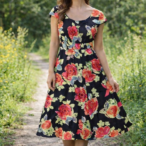Svart med blomstrete mønster.