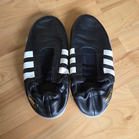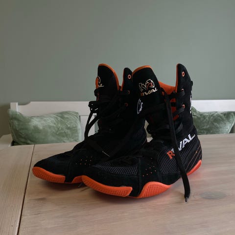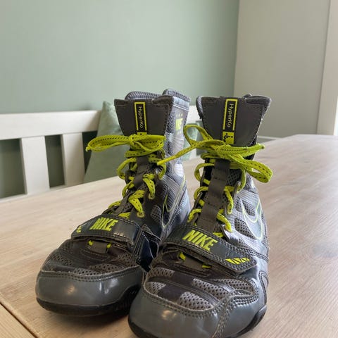 Adidas Box Hog 2 bokse- og brytesko i svart. Skoene har overdel i pustende mesh med forsterkninger i semsket materiale på utsatte områder. De har høyt skaft med snøring for god støtte rundt ankel, og en tynn, flat yttersåle som gir godt grep på matte og gulv. Størrelse EU 45 1/3 (US 11, UK 10,5). Egnet til boksing, bryting og annen kampsporttrening der det er behov for lette sko med godt fotfeste.
