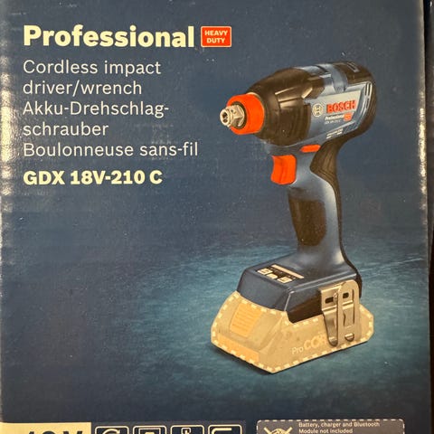 Bosch AdvancedImpactDrive 18V muttertrekker. Batteridrevet maskin for skruing og enklere boltearbeid. Settet inkluderer tre piper og en adapter/bitsholder. Følger også med 2 batterier.