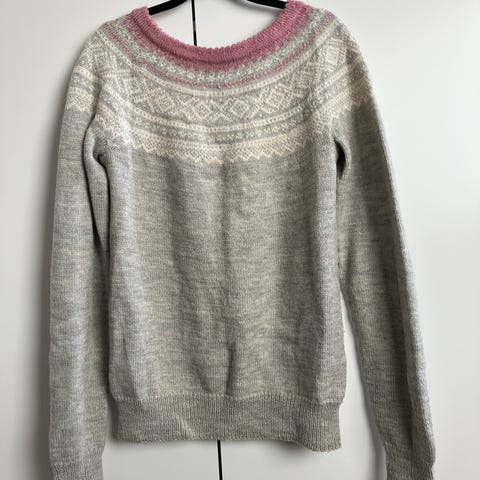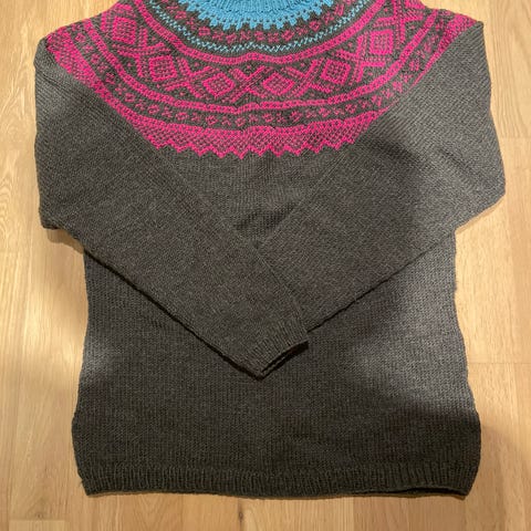 Hjemmestrikket ubrukt Mariusgenser i ullgarn. Selges pga. Den ble for stor til tiltenkt.