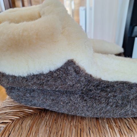 Deilig, myke, varme ulltøfler, merke "ULLNORGE", størrelse 43/44. Brukt av ru,lestolbruker i et par måneder, har aldri blitt brukt til å gå. Nypris i oktober 399
