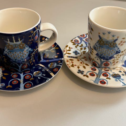 Iittala Taika espressokopp, skål og asjett med rød dekor. Asjetten har litt slitasje på midten, ellers er alt helt og blankt.