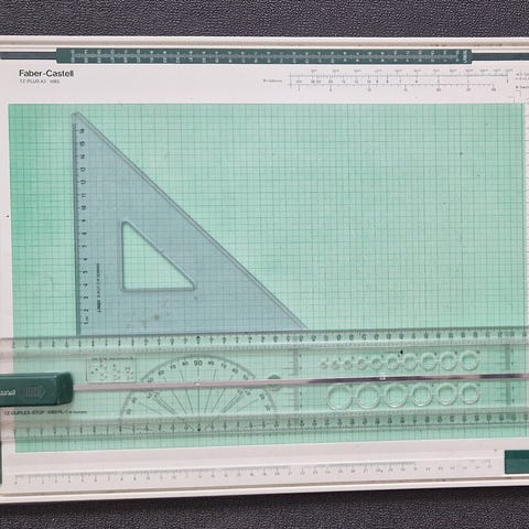 Fiskars papirkutter med rullekniv og integrert målerutenett. Kuttebrettet har tydelig inndelte rutenettlinjer med markeringer for ulike papirstørrelser (blant annet A4, A5, A6 og A7) samt mål i centimeter og tommer langs kantene. Papiret legges på platen og kuttes ved å føre rullekniven langs skinnen. Egnet til presis kutting av papir og kartong til hobbyprosjekter, kontorarbeid, scrapbooking og lignende bruksområder.