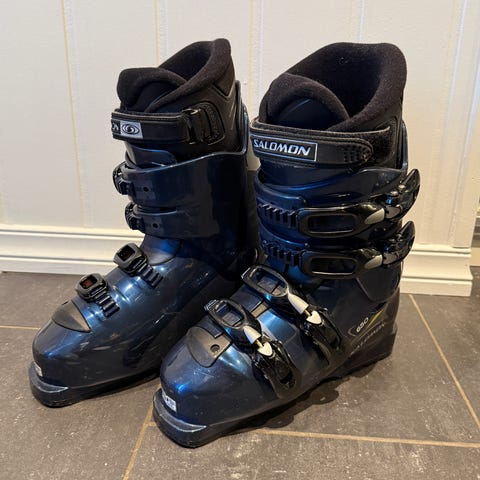 Salomon alpinstøvler i størrelse 29,0 (ca. 45 2/3). Støvlene har fire justerbare spenner i front og powerstrap øverst for bedre tilpasning rundt leggen. Modellen har myk polstret innersko for økt komfort. Farge mørk blå med svarte detaljer. Egnet til alpint bruk i bakke.