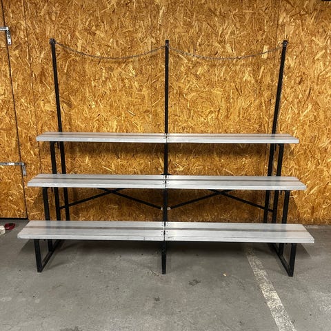 Sammenleggbar tribune med benkerader i metall. Konstruktionen består av svarte metallstativ og sølvfargede metallbenker. Tribunen kan foldes sammen for enklere lagring og transport, som vist på bildene. Egnet der man trenger en enkel, flyttbar ståplassløsning, for eksempel i haller, gymsaler eller ved arrangementer. Antall seksjoner og eksakte mål fremgår ikke av bildene og bør avklares ved interesse.