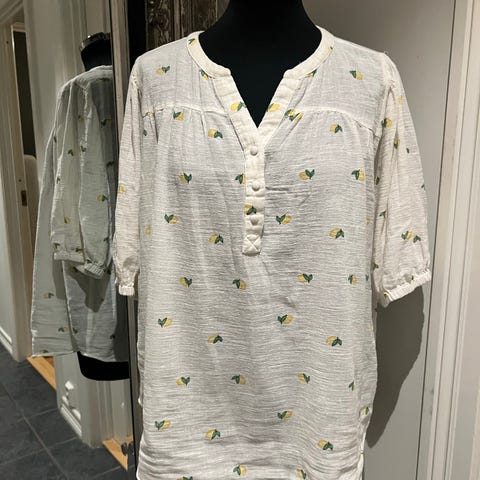 Fransa bluse for dame i størrelse L. Blusen er grå med mønster og er laget i polyester. Den har lange ermer, knappelukking foran og mansjetter med knapp. Stoffet er lett og semitransparent, egnet til hverdagsbruk eller enklere penbruk.