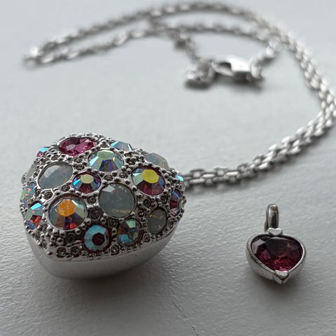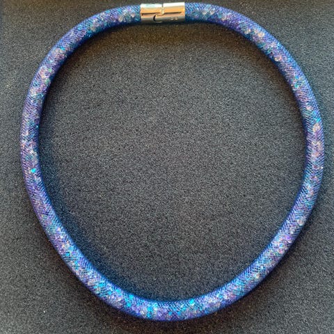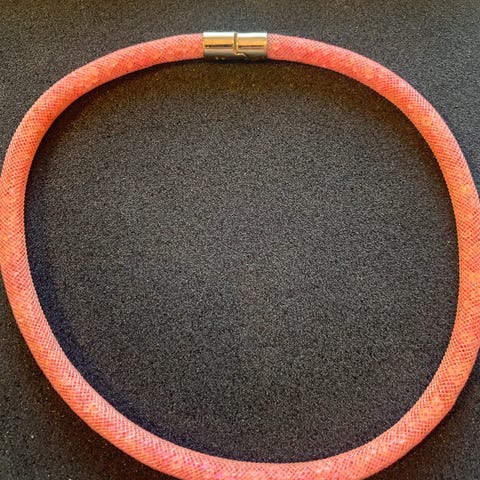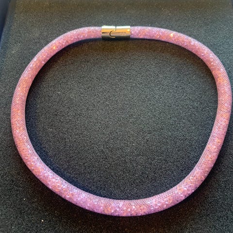 Swarovski halskjede for dame med krystaller. Halskjedet har et rørformet bånd fylt med små krystaller i en rosa/rød nyanse og en metallfarget magnetlås. Passer som smykke til hverdagsbruk eller til mer pyntede anledninger.