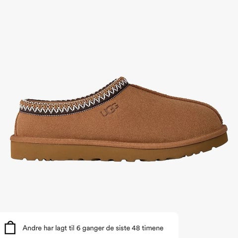 UGG sko i størrelse 37. Modellen er en åpen hæltøffel med overdel i svart materiale og kontrastsøm rundt åpningen i saue skinn.