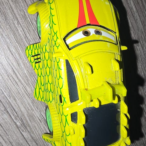 Disney Cars Tow Mater lekebil i plast og metall. Bilen forestiller bergingsbilen Mater fra Cars-filmene, med krok og taudetaljer bak. Fargekombinasjon i brun, blå og grønne detaljer, med trykte merker på sidene. Liten bil som passer til lek på gulv eller sammen med andre biler i samme serie.Detaljer om leken:
