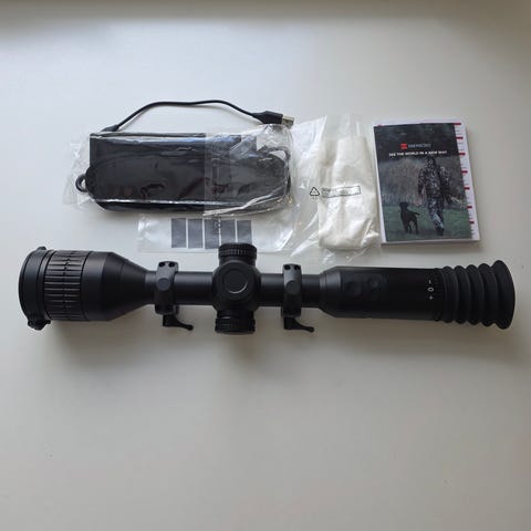 Hikmicro Thunder TH19CR 2.0 selges. Enheten har flere betjeningsknapper på toppen for styring av funksjoner og meny. Det følger med bæreveske med Hikmicro-logo, øyemusling, lader/ladestasjon og kabel. Designet for bruk som clip-on. Egnet for bruk der det er behov for termisk bilde i mørke eller krevende lysforhold. Kjøpt mai 2025, byttes ut pga overgang til annet oppsett for dagtidssikte.
