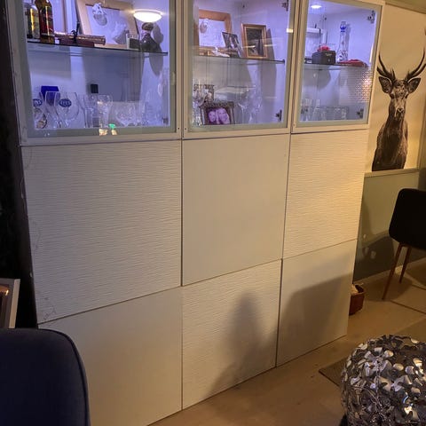 IKEA BESTÅ oppbevaringsmøbel med integrert belysning, glasshyller og glassfronter i øverst.
