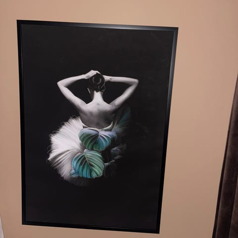 Det er glass bilde så viser noe i bakgrunnen reflekterer det som er i stuen med lyset og glansen.