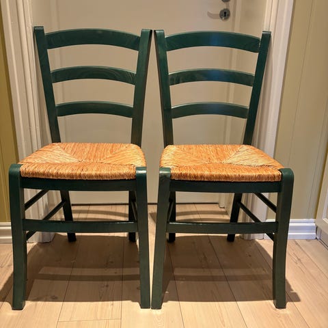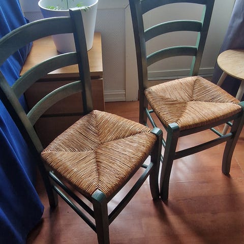 De er stabile og solide, gode å sitte i og kan brukes som de er. Viser sjarmerende spor av sitt liv i tro tjeneste. Jeg har bare brukt dem 'as is'. Rygg og armlen støtter godt opp, praktisk med barn!