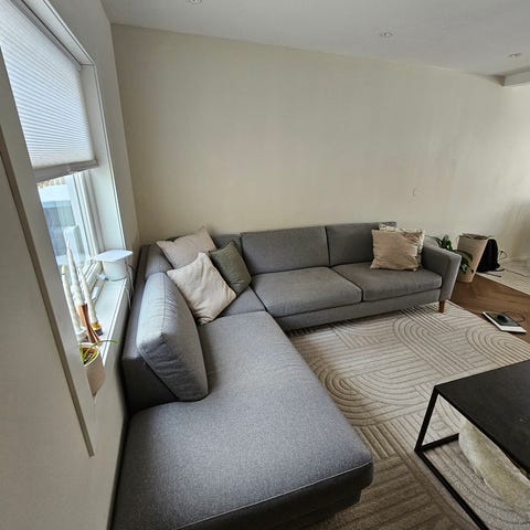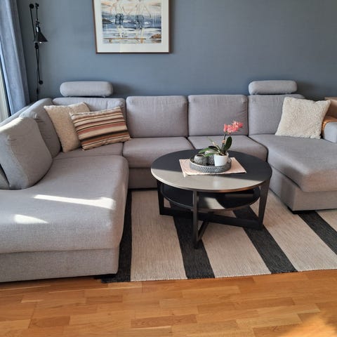 Pent brukt sofa i grå selges på grunn av flytting.