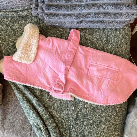 Jacson Dogwear hundedekken i rosa fleece. Dekkenet er laget i mykt, teddy-lignende fleecemateriale og har justerbar stropp rundt magen med borrelås. Det dekker rygg og bryst på hunden og har brodert Jacson-logo på siden. Egnet som et lett og varmt dekken til kjølige dager eller som ekstra lag under et regndekken.