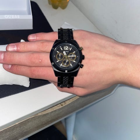 Guess herreklokke med rundt urverk og klassisk analog visning. Klokken har lys urskive med markerte timemarkeringer og gullfarget urkasse. Leveres med brun skinnrem med justerbar lengde. Passer som hverdagsklokke til herre.