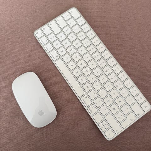 Apple Magic Keyboard og Magic Trackpad trådløst tastatur og styreflate i hvit farge. Tastaturet har lav profil med taster i full størrelse og integrerte funksjonstaster på øverste rad. Trackpaden har glatt berøringsflate tilpasset flerberøringsbevegelser.