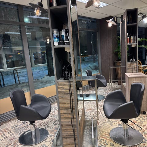 Selger 2 barberstoler i grønt kunstskinn med vertikal søm i seterygg og sete. Stolene har høy rygg med justerbar nakkestøtte, armlener og fotstøtte i metall. Understell med rund fot gir stabilitet og mulighet for rotasjon. Egnet for bruk i frisørsalong eller barbersalong ved klipp, barbering og styling. Selger også 2 arbeidsstasjoner i sort marmor laminat med matt sort benkeplate. Den en har med vask og blandebatteri og den andre med hel plate uten vask. Speil følger ikke med.
