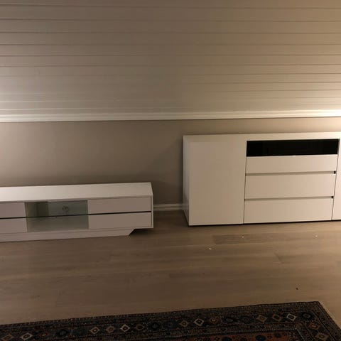 Bohus Bris skjenk i hvit utførelse med kombinasjon av skap og skuffer. Skjenken har to sideskap med glassdører og flere hyller som egner seg til oppbevaring og visning av glass og servise. I midten er det en dør med hylleplass bak, samt to skuffer øverst med metallhåndtak. Møbelet passer til bruk i stue eller spisestue for oppbevaring av servise, glass og andre gjenstander. Nypris i 2017 5700,-