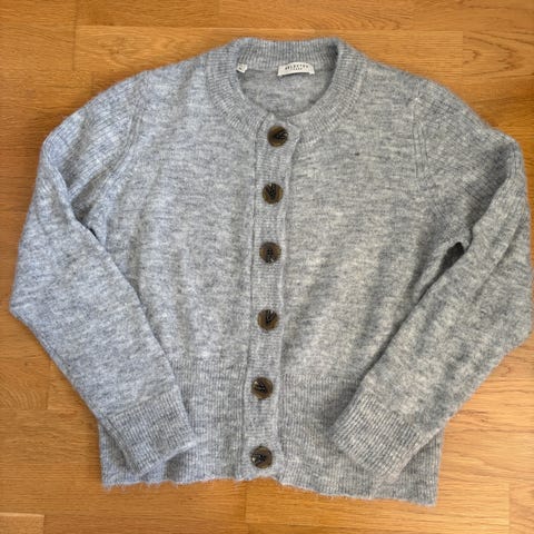 Lys grå ullgenser, genser med ullblanding: 43% ull, 30% alpakka, 23% nylon og 3% elastan. Glidelås.