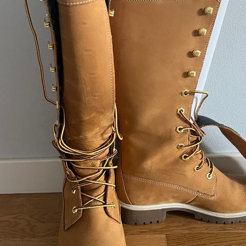 Timberland støvler i størrelse 37. Modellen er en klassisk snørestøvel i beige skinn med lys polstret ankelkrage og kraftig gummisåle med grovt mønster. Støvlene har Timberland-logo på siden og hempe bak for enklere av- og påtaking. Egner seg til hverdagsbruk og utendørsaktiviteter i kjøligere vær.