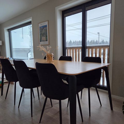 Møblene er pent brukt. Det finnes noen bruksmerker, men ellers fremstår både bord og stoler i fin stand og med god kvalitet.