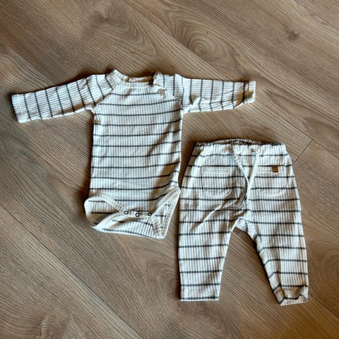 Kjempefin body og bukse-sett str. 56. Kun vasket og prøvd på da de ble for lite før vi fikk brukt det.