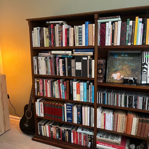 Høyde 145, bredde 155 og dybde 40 cm. Pen bokhylle, noen merker på topplate.
