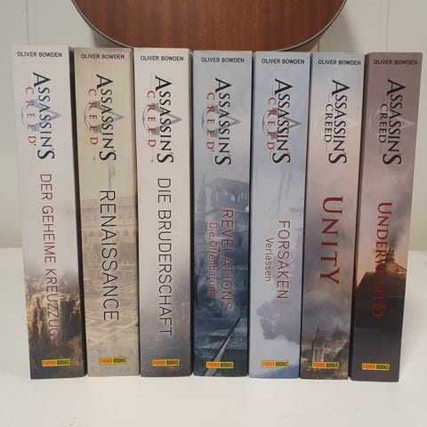 Assassin’s Creed bokserie av Oliver Bowden, engelskspråklige pocketbøker. Serien inkluderer blant annet titlene The Secret Crusade, Underworld, Black Flag, Unity, Brotherhood, Renaissance, Revelations og Forsaken. Bøkene er basert på Assassin’s Creed-spilluniverset og følger ulike snikmordere i historiske settinger. Pocketformat gjør bøkene lette å håndtere og egner seg til lesing hjemme eller på reise for lesere som liker action og historiske eventyrromaner på engelsk.