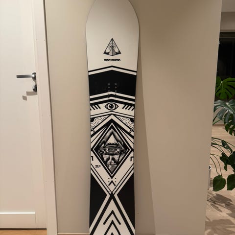 Vimana snowboard i svart og hvitt design. All mountain brett - subtle rocker og camber mellom bindingene. Lekent brett som egner seg i bakken og off pist. God bue i tupp som gjør det celsig enkelt å cruise i pudder