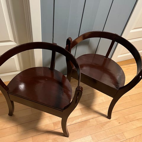 Unike heltrestoler! Laget på Finskogen. Veldig robuste med oppbevaring. Vi har hatt dem på en hytte hvor de passet bra, men hytta er solgt og vi har ikke lenger plass til stolene.