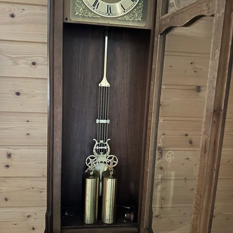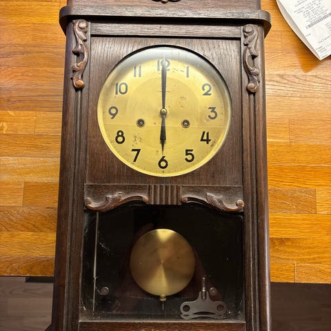 C. Iversens Eftf veggur pendelklokke i tre med brun trefinish. Klokken har rund urskive og dekorativt mønster i messingfarget utførelse. Nederst sitter en pendel med tilsvarende dekor. Kassen har utskårne detaljer og glassdør foran pendel. Mekanisk urverk med oppheng for veggmontering. Produsert av Urmaker C. Iversen, Trondheim