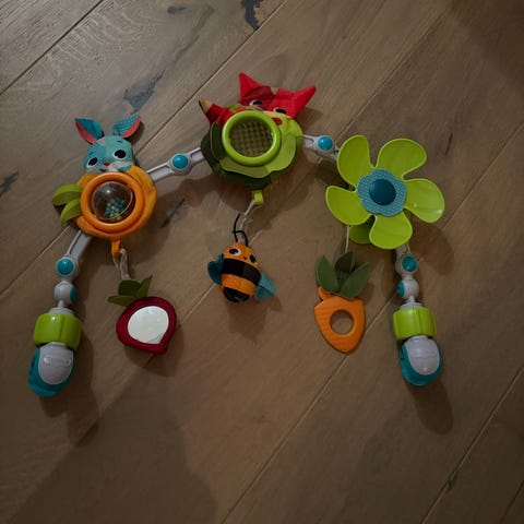 Kjempefin babyleke som kan festes på vogn, vippestol, babynest, bilstol osv.