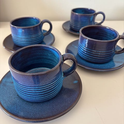 Keramikk kopper med tilhørende skåler i grønn glasur. Settet består av fire sylindriske kopper og fire skåler/fat. Innsiden av koppene er mørkglasert, mens utsiden har en dyp grønn farge med noe sjattering. Undersiden er i brent leire med innrisset signatur. Egner seg til servering av varme og kalde drikker eller som dekorative bruksgjenstander i hjemmet.