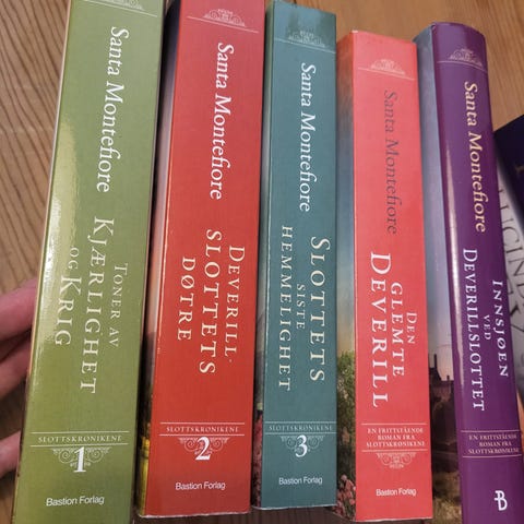 Diverse bøker av Santa Montefiore, blant annet Slottskrøniken 1-3, pluss 2 tilleggsbøker i serien, selges. Bøkene er pent lest av en person og alle er innbundet. Kan sende og har Vipps.