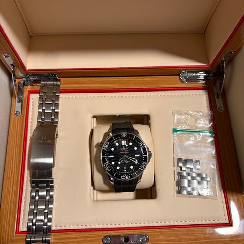 På bildene følger original Omega-eske og internasjonalt garantikort, samt ekstra ledd til lenken. Egner seg som dykkerinspirert hverdags- og penklokke for herre.