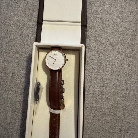 Selger en Daniel Wellington klokke, pent brukt. Følger med oppbevaringsboks, autentisk bevis, og en svart lærreim.