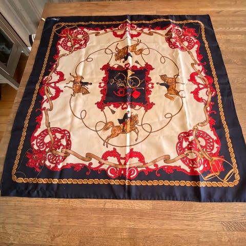 Hermès skjerf i silke for dame i one size. Skjerfet er flerfarget med motiv som inkluderer vinter- og juleinspirerte elementer som snøfnugg, kristtorn, misteltein, figurer på ski og dekorative border. Materialet er 100 % silke med glatt overflate og trykket mønster. Størrelsen er one size og passer til ulike måter å knyte skjerfet på, for eksempel rundt halsen, over skuldrene eller som hodeplagg.