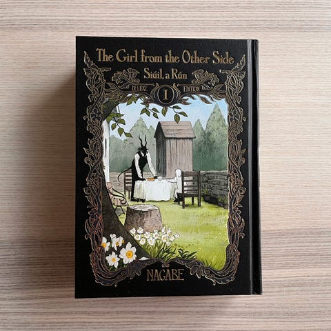 Nagabe The Girl from the Other Side Siúil a Rún deluxe edition manga på engelsk. Første omnibus inneholder volum 1-3, og andre inneholder volum 4-6. Mørke, estetiske illustrasjoner. Innbundne bøker med svart omslag og gullfarget dekor på cover og rygg. Det er synlig skade på øvre hjørnet på én av bøkene, som vist på bildene. Ellers i god stand. Bøkene selges samlet.