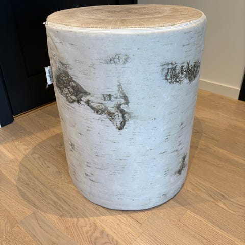 Ygg&Lyng Mingle puff med bjørkestamme-print. Sylinderformet puff som kan brukes som ekstra sitteplass eller fotskammel. Tekstiltrekk med trykk som etterligner hvit bjørkestamme og årringer på toppen. Passer i stue, gang eller soverom som et fleksibelt møbel og interiørelement.